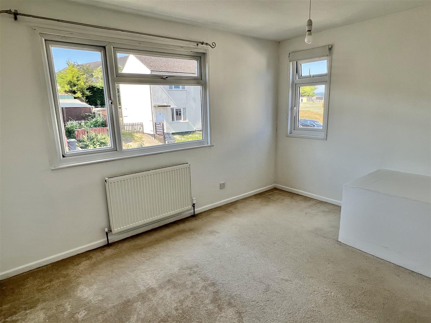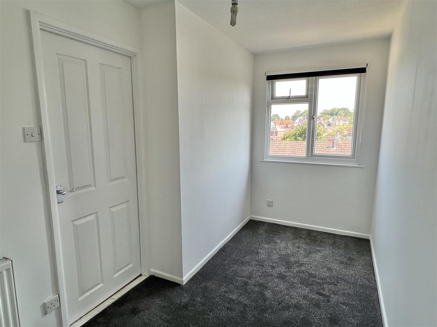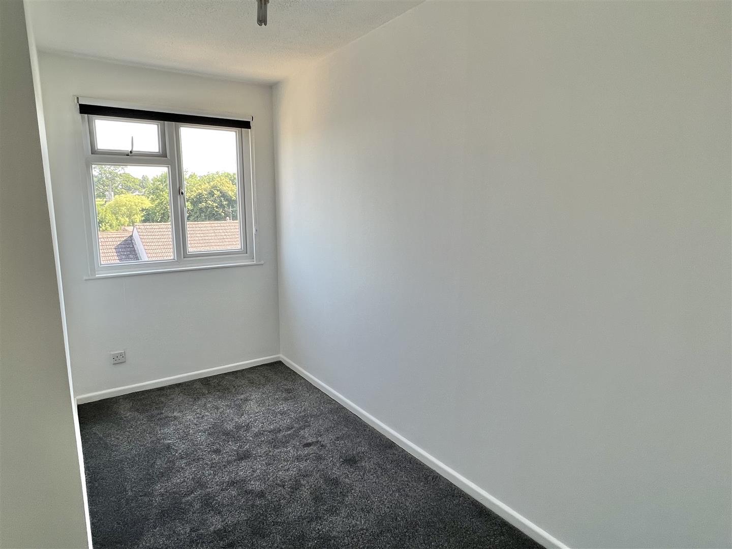 Cream fitted carpet. White paintwork. Magnolia walls. White aertex ceiling. Double glazed window with brown roller blind. Wooden plaque with 3 hooks. Pendant light fitting.