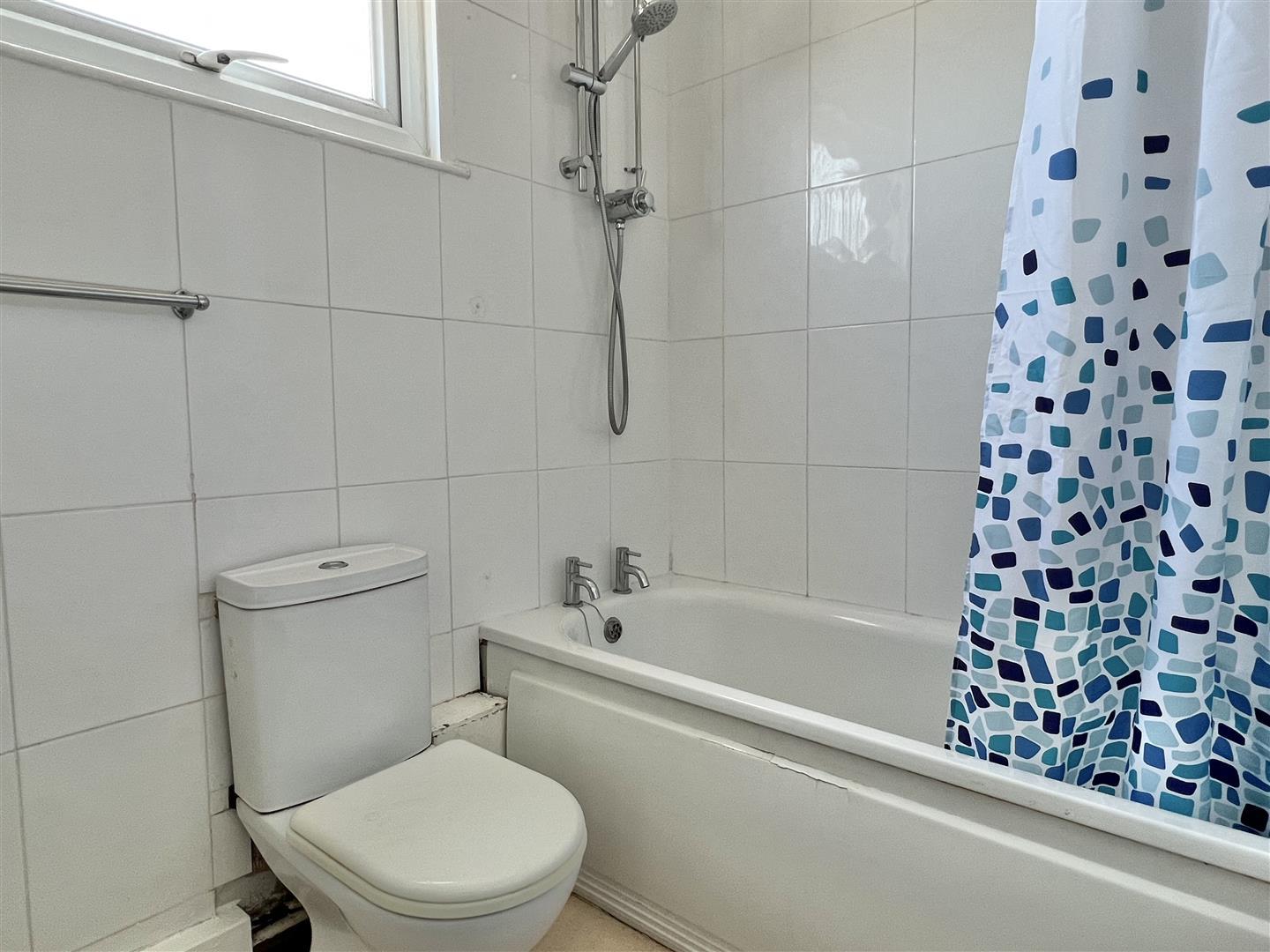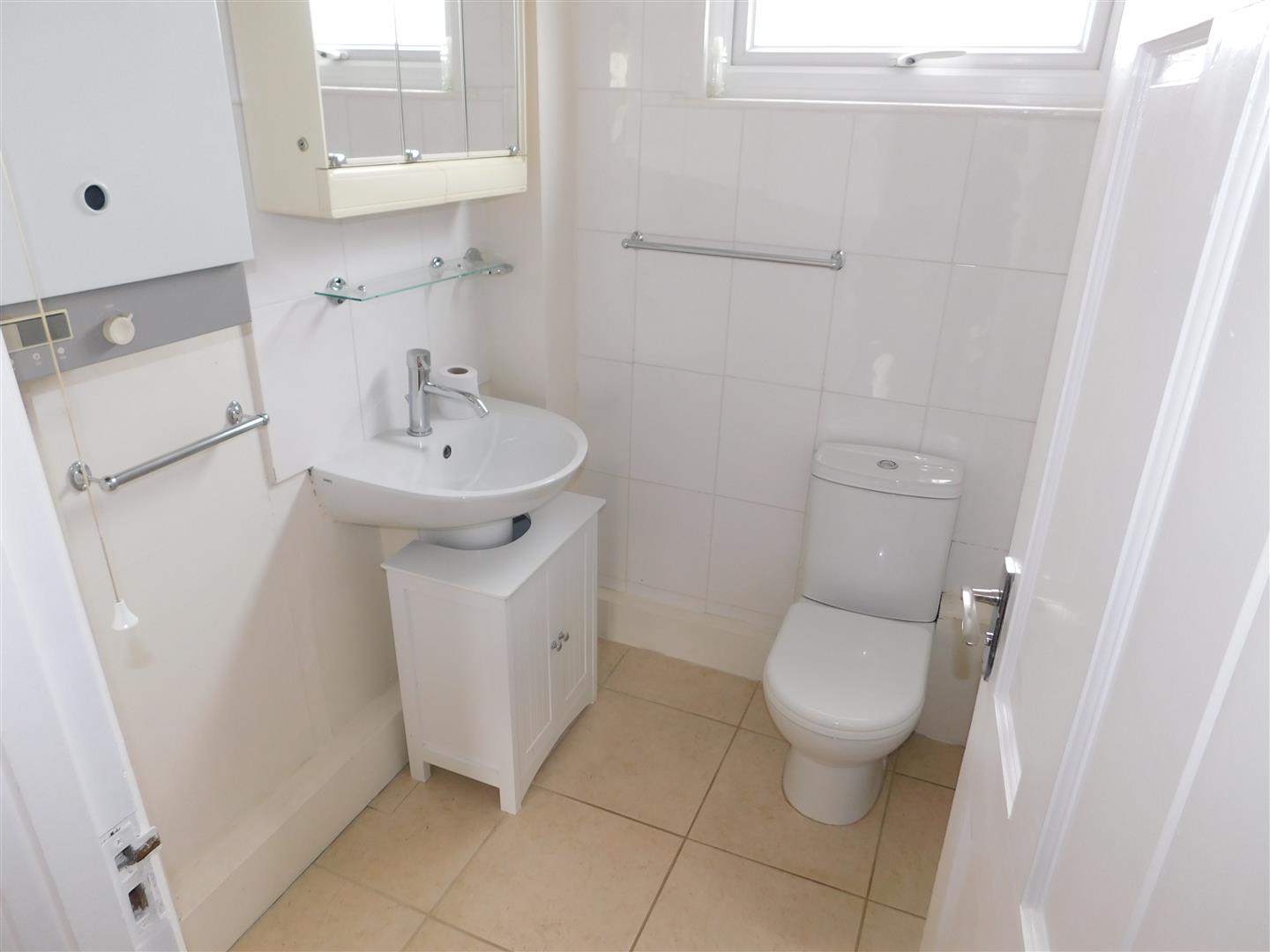 Cream mottle floor tiles. White wall tiles. Magnolia painted wall. White aertex ceiling. Pendant light fitting with glass shade. Obscure double glazed window. White vanity basin with cupboard below. Glass floating shelf. Medicine cupboard. White bath. White toilet. Triton electric shower. Shower curtain. Chrome wall mounted towel rails. Boiler. Carbon monoxide alarm.