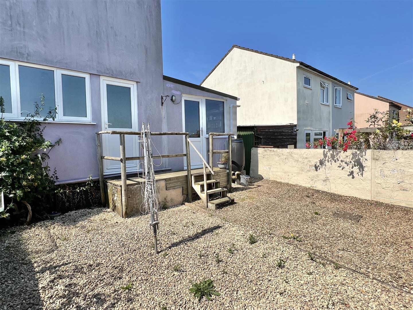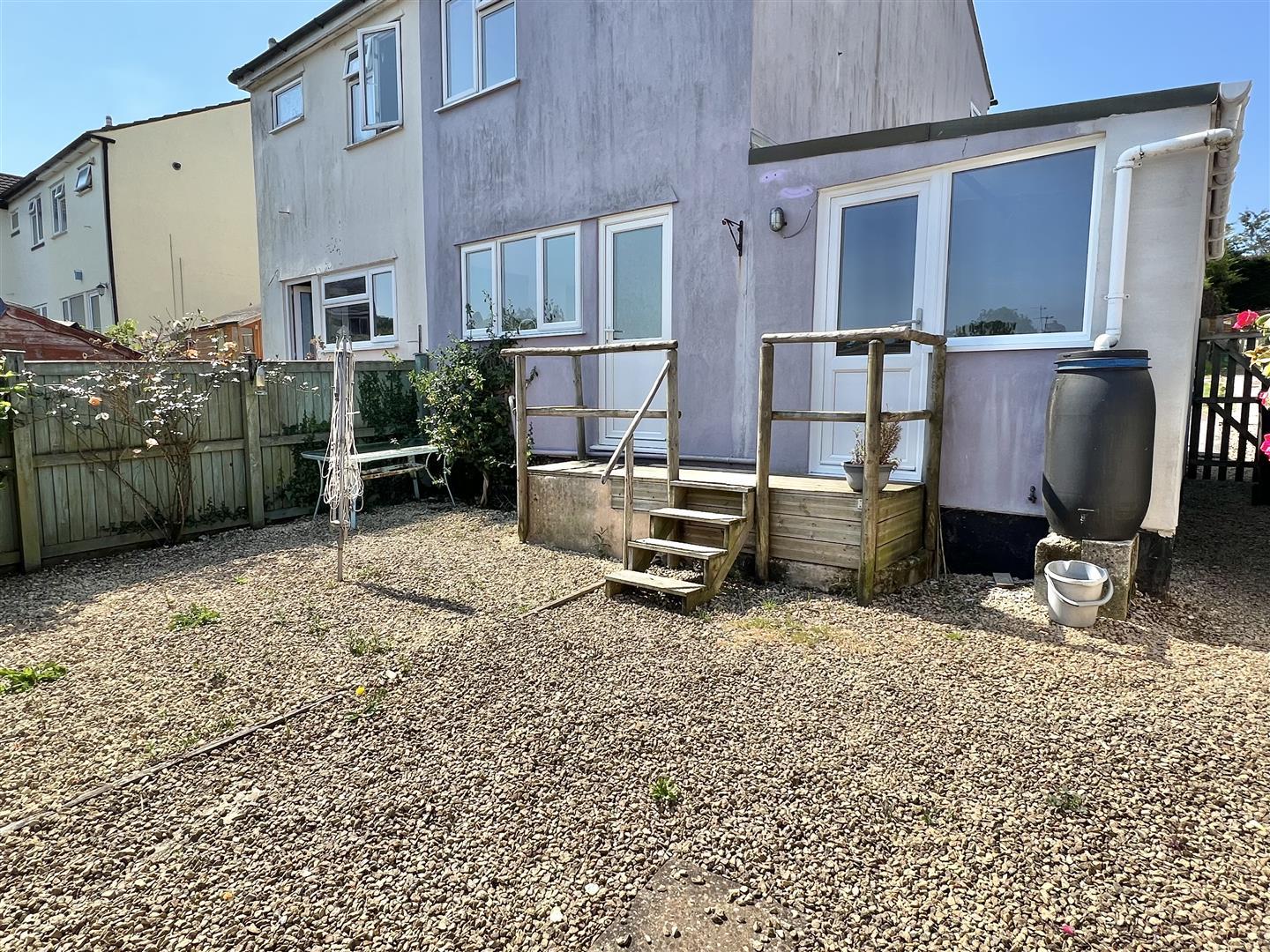 Decking area with 4 steps down. 2 separated gravel areas. Washing line. Established plants. Trellis. Fencing. Brick wall. Table and chairs. Water butt. Door to garage.
