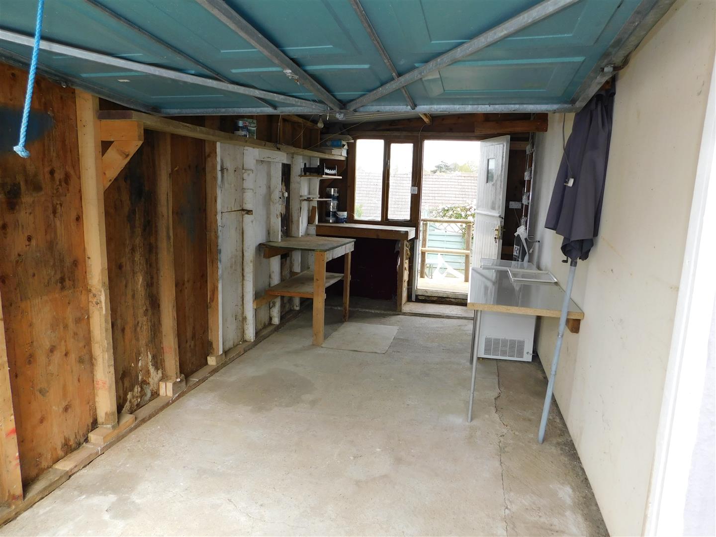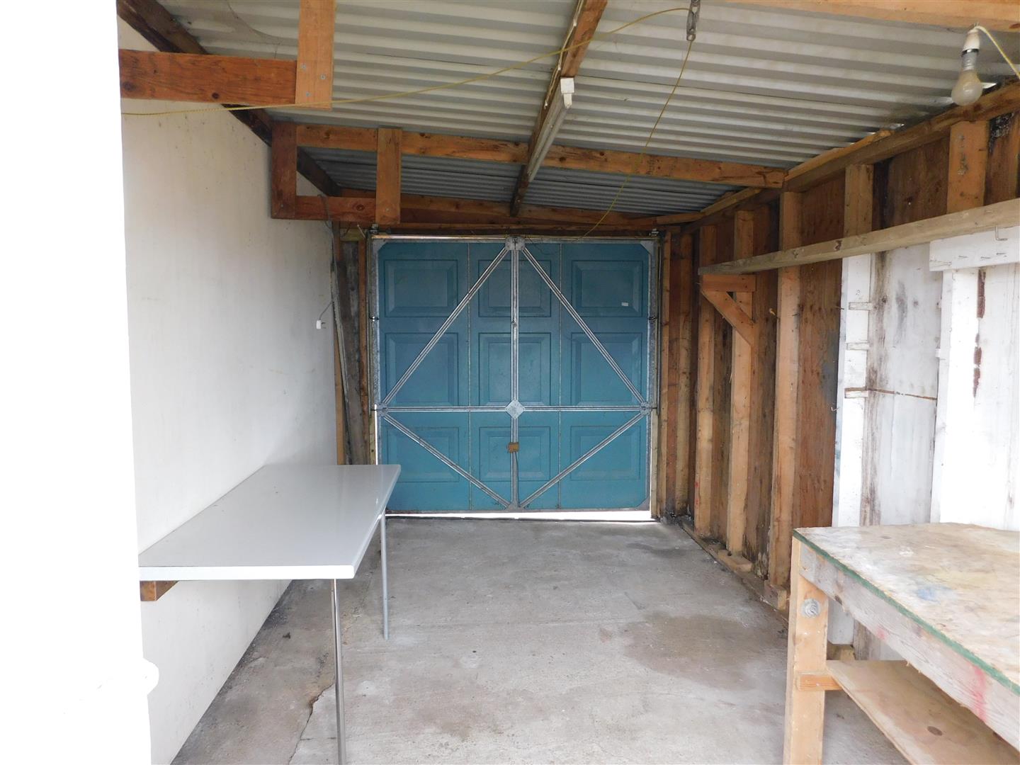 Gravel area. Pear tree and green gage tree. Concrete path. Leaning porch. Outside light. Post box. Electricity and gas meter. 2 metal hanging brackets. Garage. Glazed uPVC front door.
