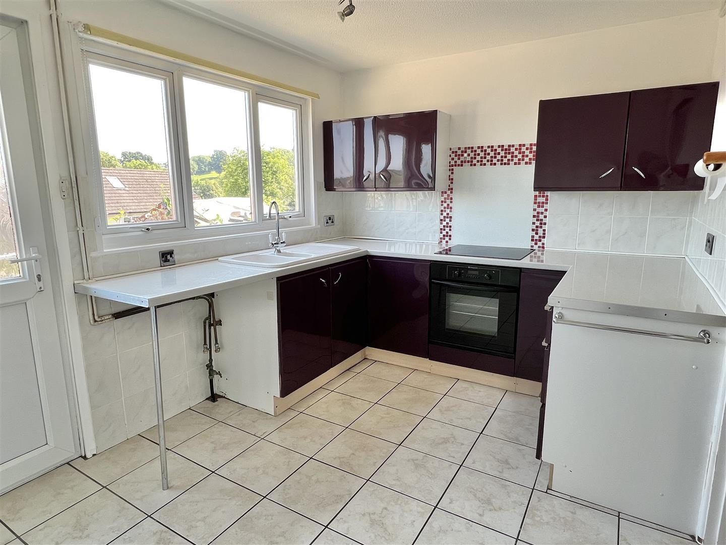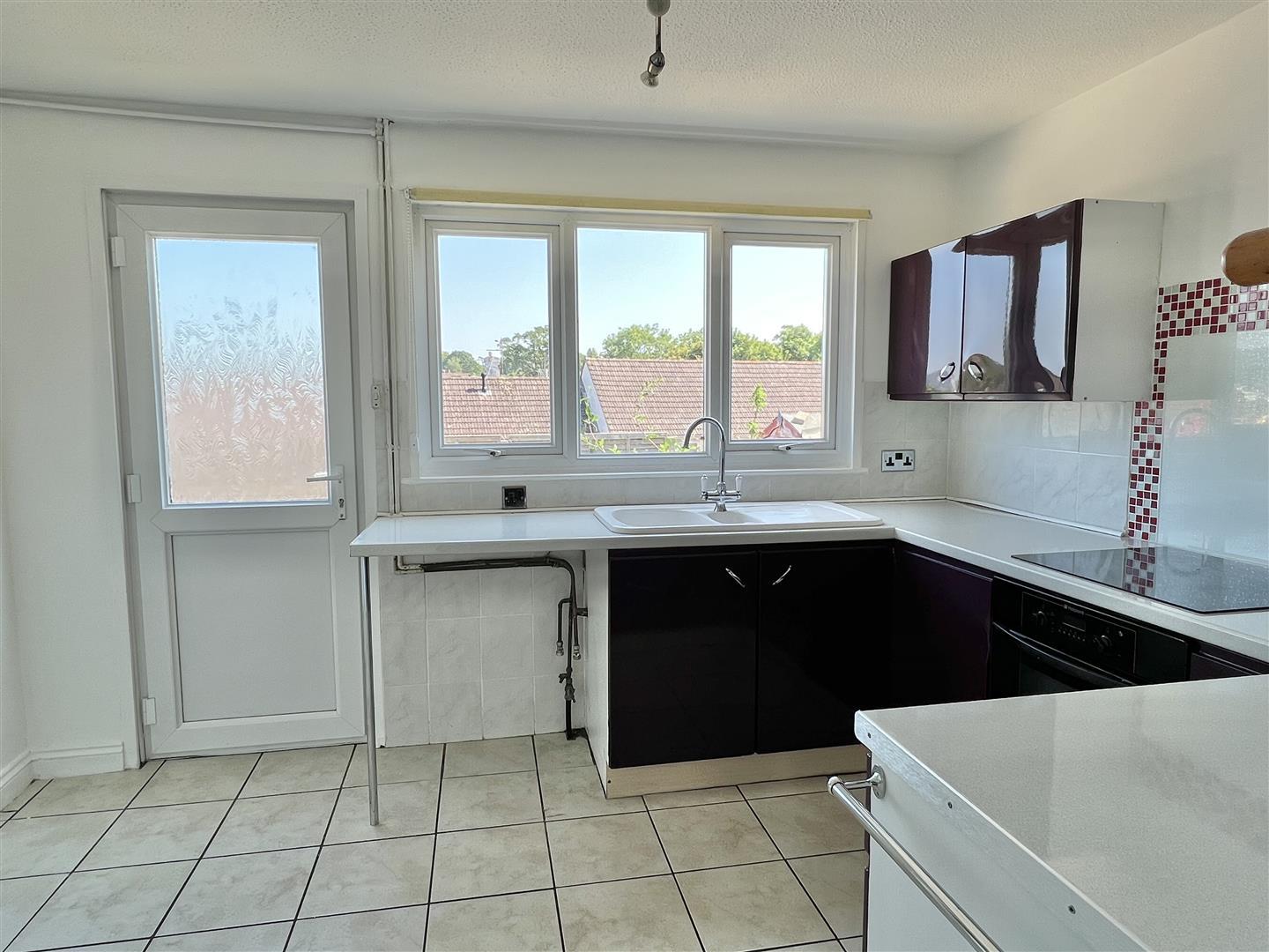 Mottle effect floor tiles. White paintwork. Magnolia walls. White aertex ceiling. Chrome 4 bulb spotlight fitting. Mottle effect cream work surfaces. Bloomberg integral ceramic hob. Hotpoint electric oven. White resin 1 and half bowl sink. Purple ceramic wall and base units with chrome handles. Mosaic splash back to hob. Cream mottle effect wall tiles. Double glazed window with yellow roller blind. Obscure glazed uPVC back door.