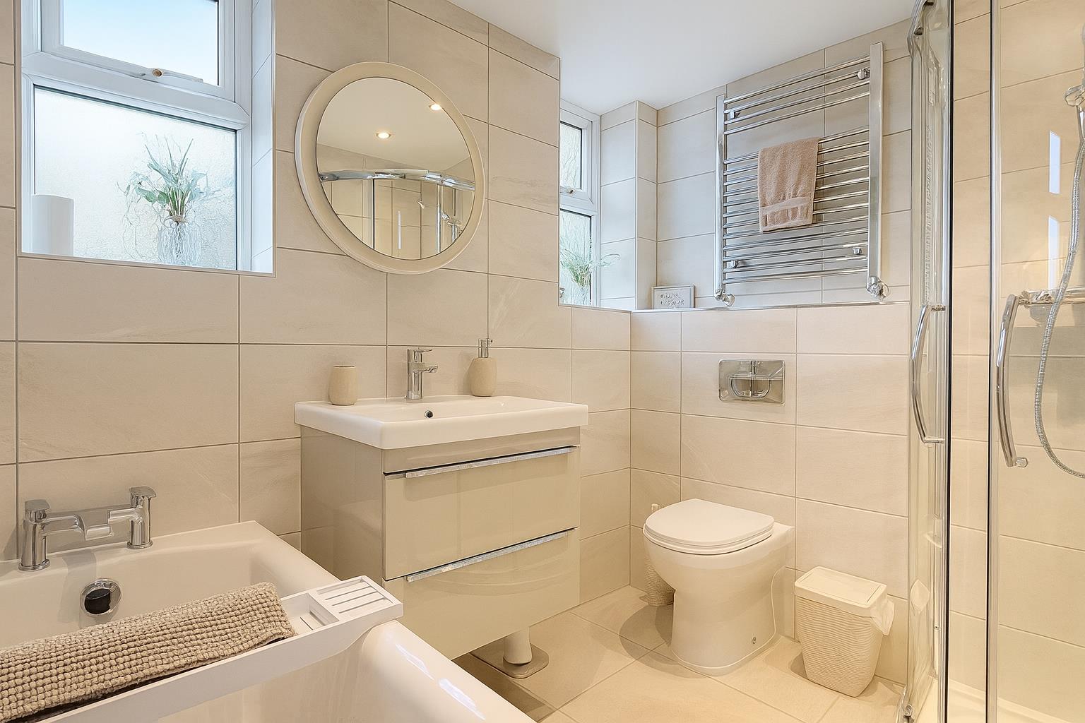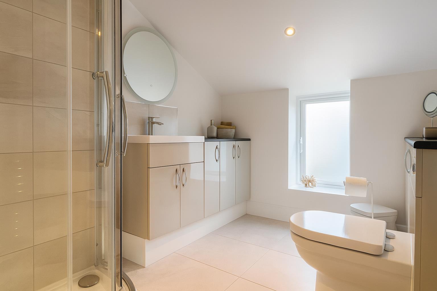 Fitted with a white suite comprising a shower unit with a wall mounted mains shower, a hand wash basin and a low level hand flush w.c. inset into a range of vanity units. Further benefiting from a heated towel rail and an opaque window to the rear aspect.
