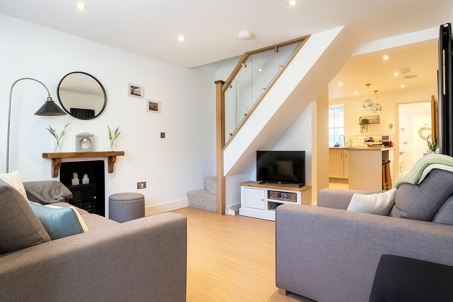 A cosy reception with a decorative fireplace and stairs leading to the first floor accommodation. Further benefitting from a floor to ceiling radiator.