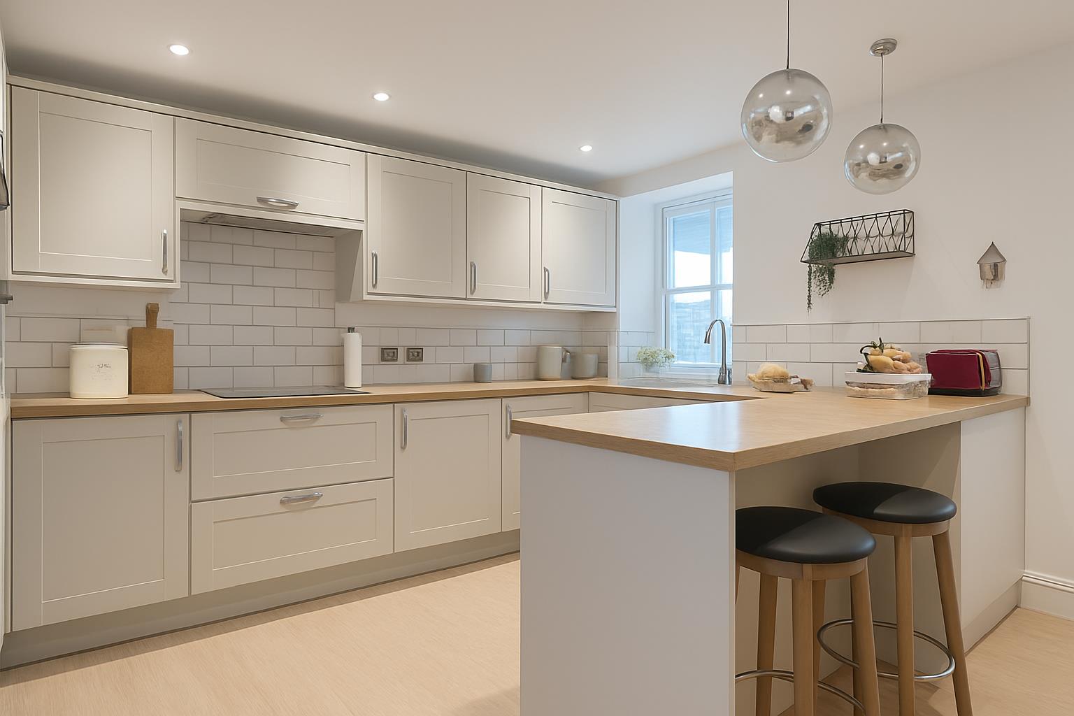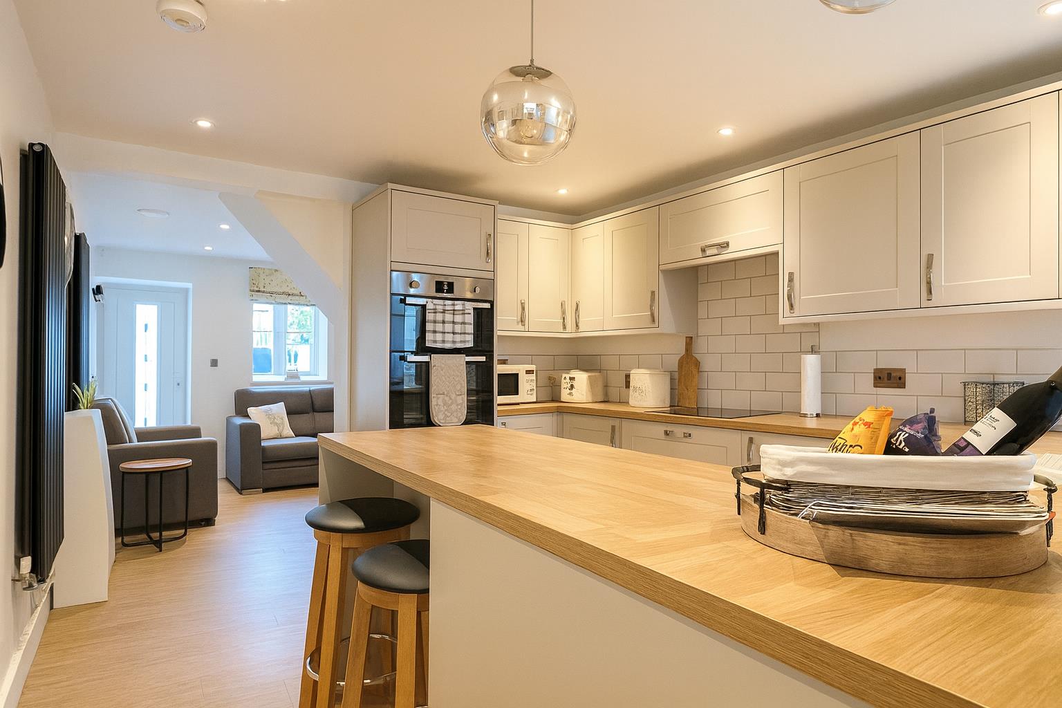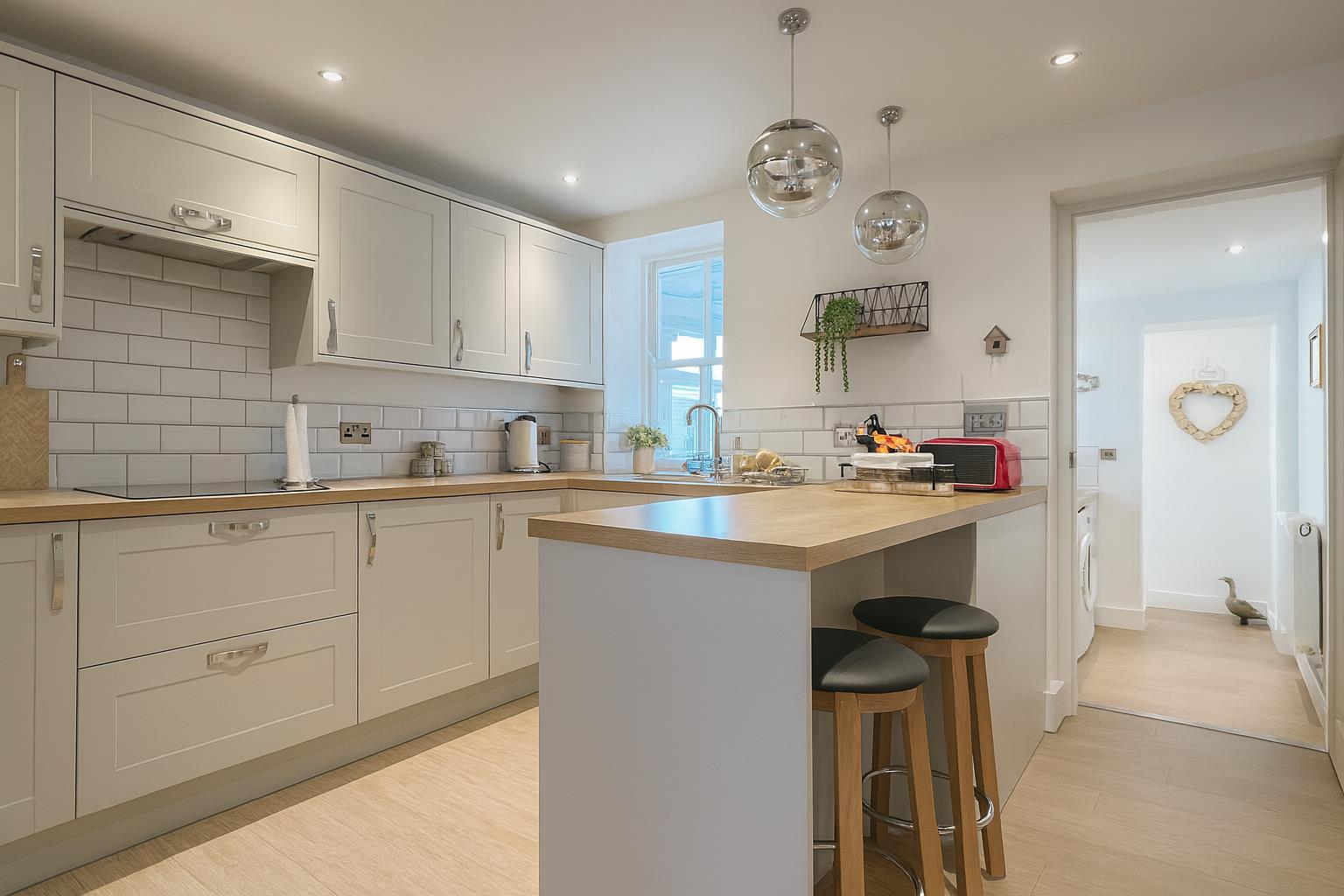 Fitted with a range of matching wall and base units with work tops over this integrated kitchen is fitted with an eye level double oven, a four ring electric hob with an extractor hood above. Continuing round to a half fridge, slimline dishwasher and a stainless steel one and a half bowl sink and drainer. Further benefiting from a window to the rear aspect and breakfast bar.