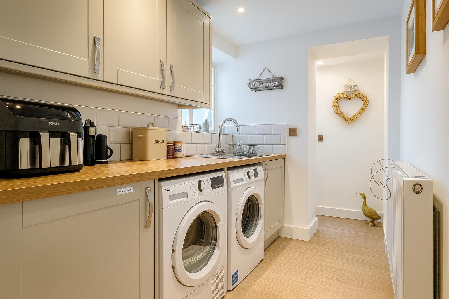 Fitted with a matching wall and base units this useful utility room is fitted with a half freezer and a stainless steel sink and drainer. There is space and pluming for two additional white goods under the work top. Further benefiting from a window to the side aspect and radiator.